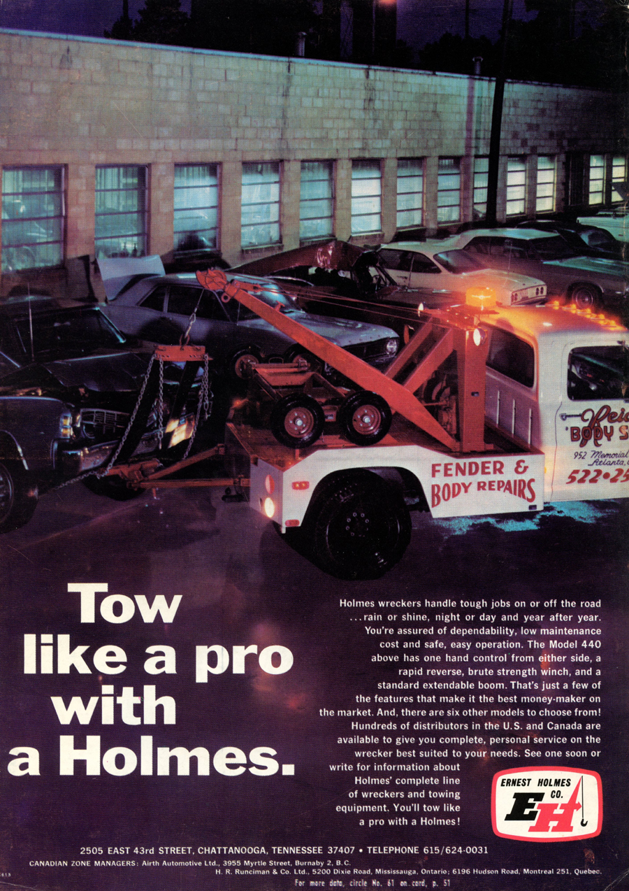 HOLMES 440 In the late 50’s and early 60’s Holmes was marketing the 400 and 400 RW wreckers to service stations; and they developed the new Holmes 440 for this market. Moving away from channel and angle iron frames the 440 offered a stylish formed steel head frame and body assembly with an extendable boom center section. The first 440 was serial # A66CF – 101 and was shipped Jan 11, 1966 – all 440’s had “CF” as the ID code; 440 Hi Power were coded “CFH” and the rare factory hydraulic units had “HYD” at the end of the serial number.